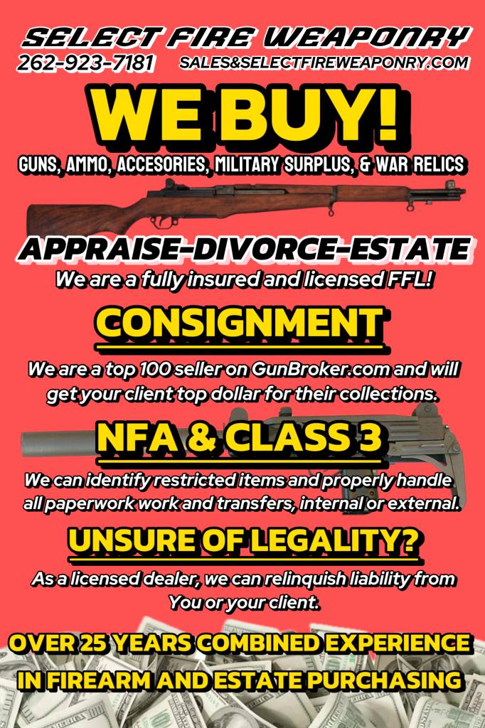 For estates and larger collections it may be more convenient for us to come out and visit you! Call and ask for Kris, Steven, or Colton or email sales@selectfireweaponry.com to make an appointment!